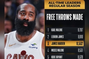 本场比赛过后,哈登生涯总罚球命中数来到8535个,超越摩西·马龙(8531个)升至历史第3,排在第2的是詹姆斯(8810个)。