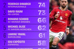 体育资讯3月3日讯 Squawka数据统计显示,B费是本赛季五大联赛创造机会最多的球员。