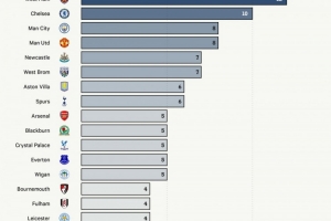 第二、第三名分别为南安普顿和西汉姆,均为12次,紧随其后的则是切尔西、曼城和曼联。
