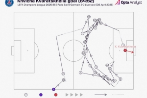 据统计,克瓦拉茨赫利亚进球前巴黎共完成27次连续传球,在本赛季欧冠仅有3粒进球比这次破门前传球次数更多。