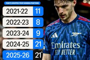 体育资讯02月19日讯 据Prime Video Sport UK统计,阿森纳在本赛季英超联赛中已经在位于榜首位置时丢掉了21分,追平了上赛季的总数。