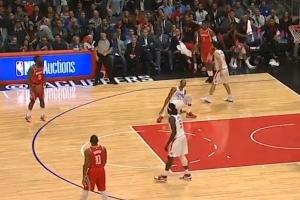 比赛第一节,哈登连续胯下之后撤步,将韦斯利·约翰逊干干净净晃倒在地,哈登还顺势低头瞅了一眼,转球之后轰进三分,引起全场哗然。