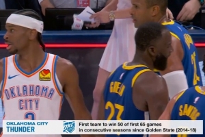 体育资讯3月8日讯 今日NBA常规赛,雷霆主场104-97拿下勇士,战绩来到50胜15负。