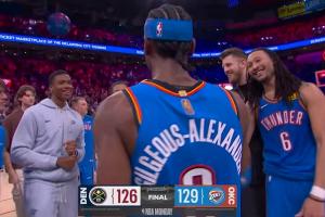 比赛最后时刻,亚历山大先是打进一个关键三分,帮助雷霆领先4分,随后掘金极限3+1(约基奇三分,穆雷罚球)扳平比分。